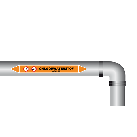 Leidingmarkering voor chloorwaterstof. Gebruik deze sticker om aan te geven welke leiding als chloorwaterstof gemarkeerd moet worden. Te gebruiken met ruimtes met zwavelleidingen, bijvoorbeeld in een laboratorium of in de industrie. De sticker is geschikt voor zowel binnen- als buitengebruik. Kies bij buitengebruik de optie “beschermfolie” voor extra bescherming tegen UV straling en water (en dus een langere levensduur).