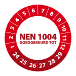 Bestel hier uw ‘NEN 1004 goedgekeurd tot 2024’ keuringsstickers op makkelijk hanteerbare rollen. De stickers hebben een diameter van 3 cm en worden geleverd met een UV beschermlaag. Ze zijn daarom ook geschikt voor outdoor gebruik en kunnen prima tegen een stootje. Heeft u speciale wensen? Bel of mail dan gerust voor een offerte op maat!