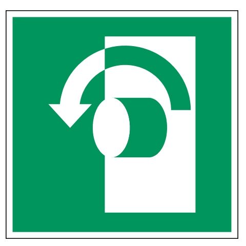 E018 openen door naar links te draaien pictogram. Gebruik deze sticker om aan te geven dat je naar links moet draaien om het voorwerp te openen. (NEN ISO 7010). De sticker is geschikt voor zowel binnen- als buitengebruik. Kies bij buitengebruik de optie “beschermfolie” voor extra bescherming tegen UV straling en water (en dus een langere levensduur).