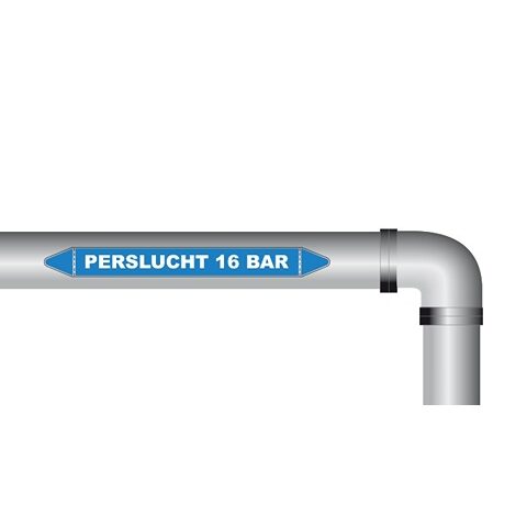 Leidingmarkering voor perslucht 16 bar. Gebruik deze sticker om aan te geven welke leiding als perslucht 16 bar gemarkeerd moet worden. Te gebruiken in ruimtes met luchtleidingen, bijvoorbeeld bij een luchtinstallatie of in een onthardingsinstallatie. De sticker is geschikt voor zowel binnen- als buitengebruik. Kies bij buitengebruik de optie “beschermfolie” voor extra bescherming tegen UV straling en water (en dus een langere levensduur).
