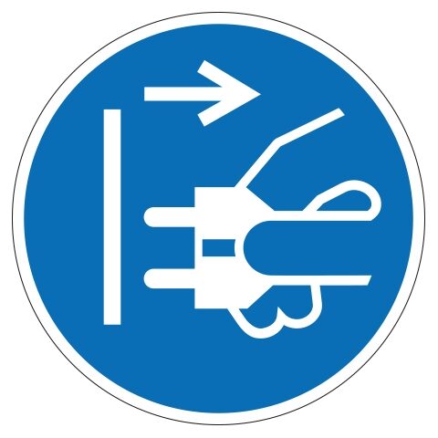 M006 stekker uittrekken. Gebruik deze sticker om aan te geven dat de stekker verplicht uit het stopcontact getrokken moet worden. (NEN ISO 7010). De sticker is geschikt voor zowel binnen- als buitengebruik. Kies bij buitengebruik de optie “beschermfolie” voor extra bescherming tegen UV straling en water (en dus een langere levensduur).